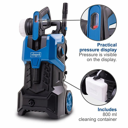Električni perač visokim pritiskom savršen je dodatak za kuću, dvorište ili gradilište. Snažni motor snage 2400 W stvara maksimalni pritisak od 180 bara, čime pouzdano uklanja tvrdokornu prljavštinu, alge ili mahovinu sa prilaza, površina, terasa, vozila ili vrtnog namještaja. Mlaz visokog pritiska može se podešavati pomoću višenamjenske mlaznice za visoki pritisak i deterdžent, a radni pritisak prikazuje se na dršci pištolja. Automatsko uključivanje i isključivanje motora dodatno smanjuje potrošnju vode i energije.